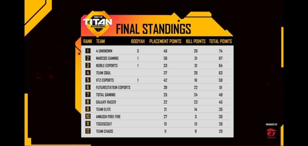 Free Fire Titan Invitational: Final Standings