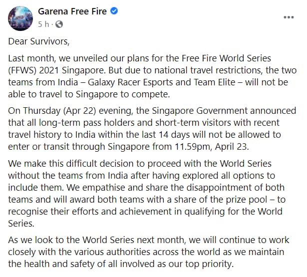 Garena Free Fire India Official has released an announcement on their socials expressing their disappointment and empathy with the teams representing India, namely, Team Elite and Galaxy Racers Esports over this travel restriction. As such, it has decided to award both the teams a share of the Prize Pool in recognition of their efforts and achievements in qualifying for the World Series.