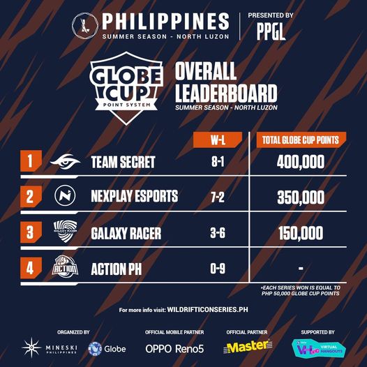 For winning the series and ending up in second place, Team Secret along with Nexplay Esports, who were the Philippines Preseason Champions, secure their spots in the playoffs of the tournament’s summer season. Moreover, they win a prize of 400,000 and 350,000 Globe Cup Points which can be converted to cash prizes by the end of the tournament. Meanwhile, Galaxy Racers win 150,000 Globe Cup Points for finishing in third place though they lost their spot to the tournament’s playoffs along with Action PH for finishing in fourth place.